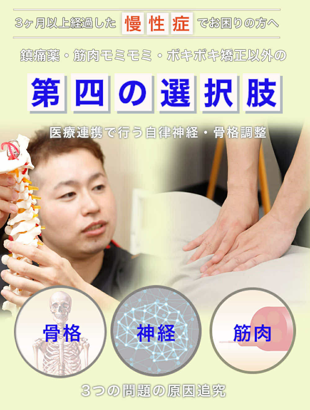 他所は比較的に神経の反応(回復力)が旺盛な急性期を得意とするのに対して、当院は悪い状態に慣れてしまった・年月をかけて原因【異常】を見過ごしてきてしまった慢性症の方に特化してフォローしています。
