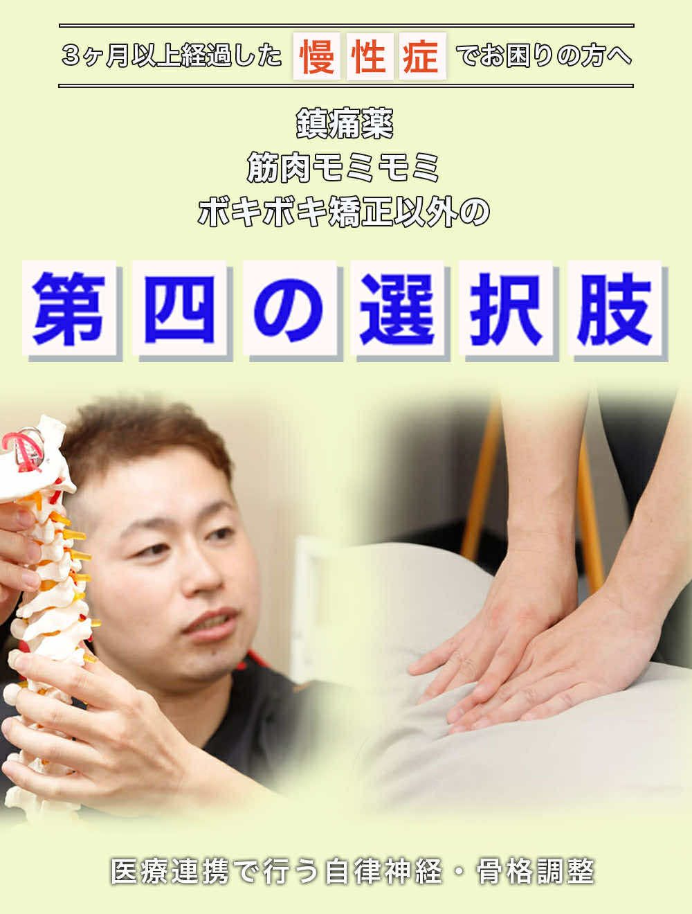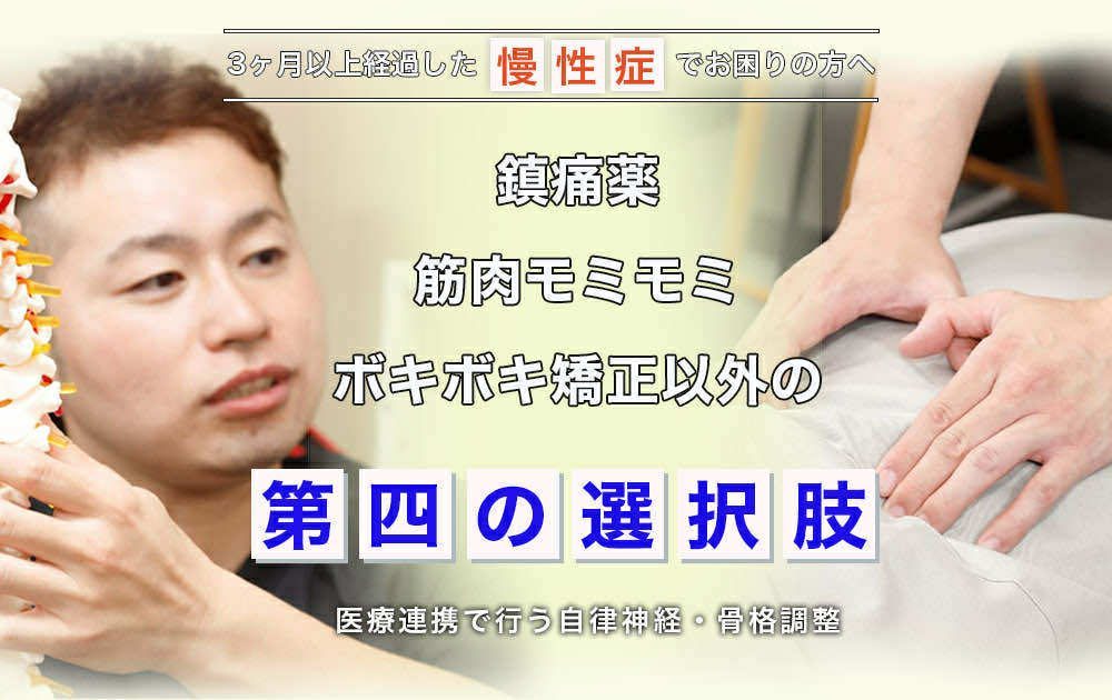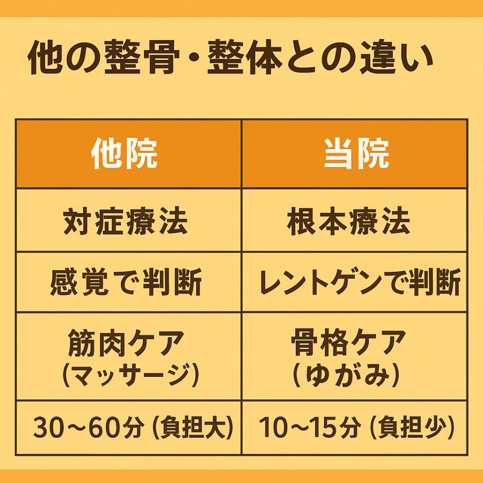 他所では症状”だけ”を一時的に早く緩和する事を目指すのに対し、当院では根本的な改善を目指す治療院です。