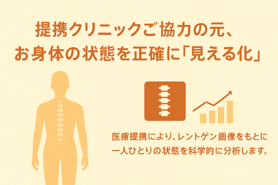 当院では、**レントゲン分析(提携の鳥越脳神経外科様との併用)**に基づき、全身の歪みを詳しく把握し、首や骨盤の矯正など、根本的なバランスを整える施術を行います。